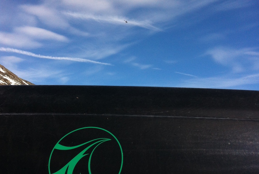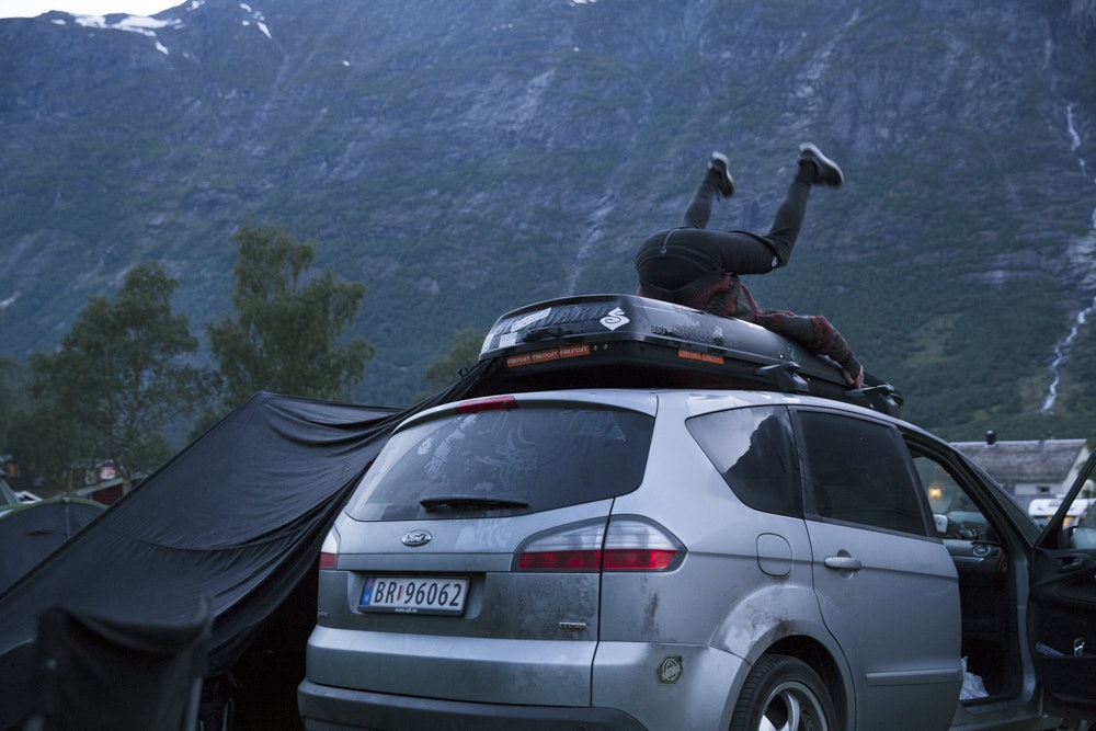 FØR OG NÅ: Mye kan sies om det å være Stryneturist om sommeren. Mange mener sjarmen er borte og at alt var bedre før. Vi synes det er like fett i 2014 som på nittitallet da det var tre halfpiper på breen. Her ser vi et gammelt Aloha Hemp-klistremerke på en skiboks og et helikopter med en av helgas gjester på Stryn – Andre Pracek. De som mener at bilparken til norske skibomser har blitt i overkant fancy – slå denne. Smartfoto: Hans Petter Hval