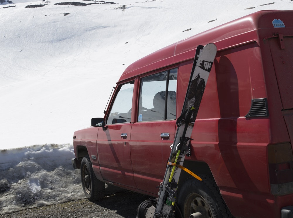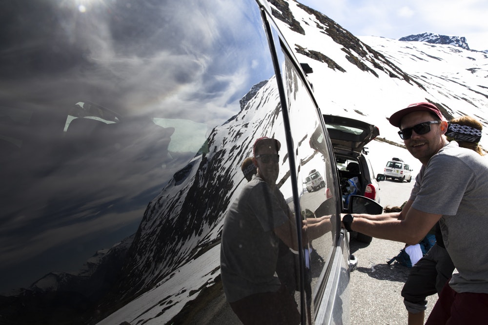 STILFULLT: Lørdag morgen på Stryn Sommerski. Oppe til venstre ser du noen early-birds som sløsjer seg ned Tystigbreen. Til høyre ser du en stilig bil med stilig valg av ski + binding. Foto: Hans Petter Hval
