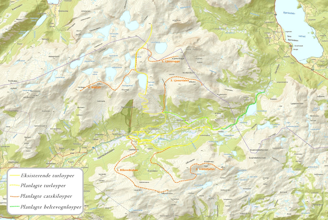 Slik er de fem catskiløypene tilknytta Harpefossen planlagt (trykk på bildet for større versjon). Beskrivelser under bildet: