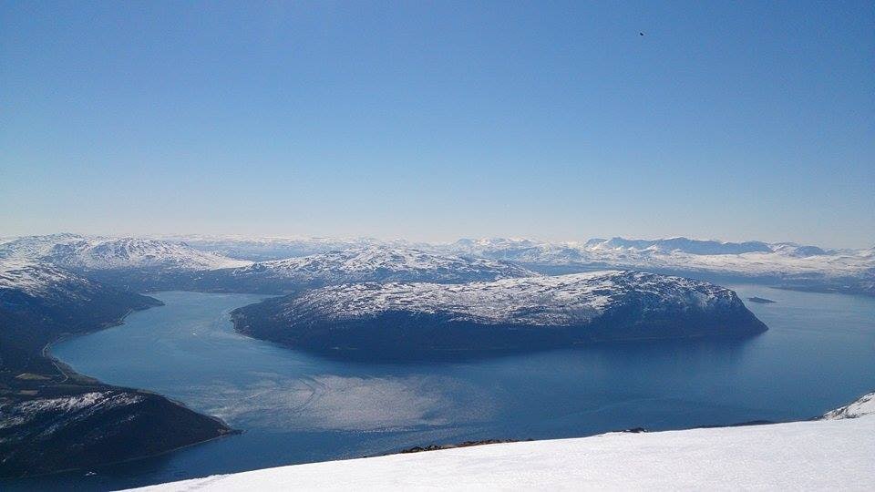 KLASSIKER: Laslettind har fortsatt gode snøforhold. Utsikt fra toppen mot Burfjord og Kvænangen. Foto: Bjarte Hollevik.