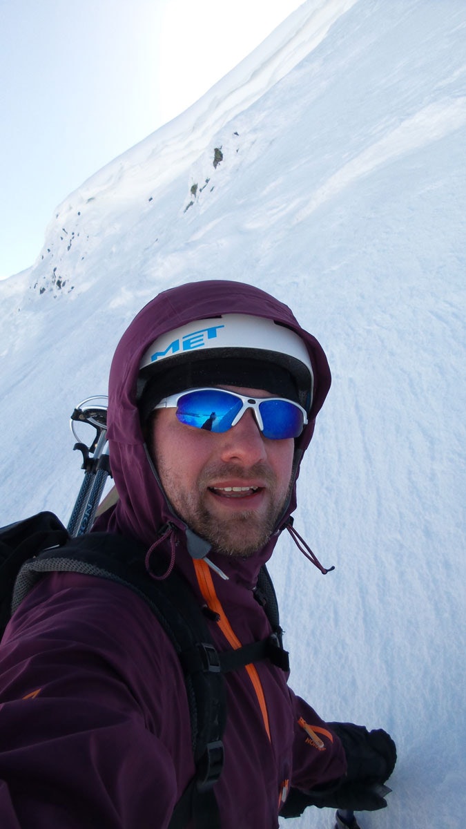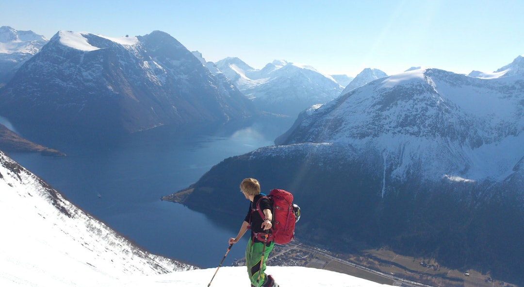 Øyvind Vadla er en av Norges mest legendariske klatrere, men et utall utrivelige og vellykkede førstegangsbestigninger i Trollveggen og en drøss andre svære vegger rundt omkring i verden. Når Vadla er skiguide er det den nokså alpine toppen Grøvelnebba hjemme i Sunndalen som gjelder, og dette bildet tok han på nettopp denne toppen i helga: