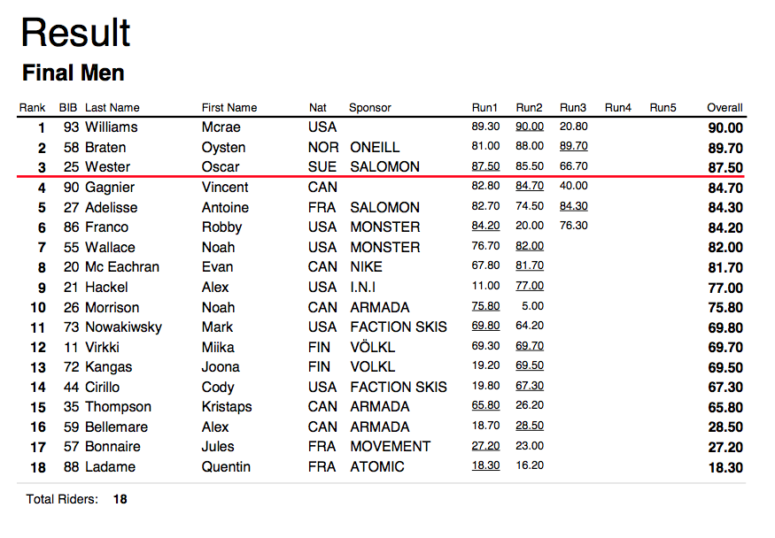 Amerikanske McRae Williams vant, og svenske Oscar Wester ble nummer tre i konkurransen som er gullevent på AFP-touren. Bråten gjorde hele tre dobbelflips i sitt run + en nydelig høyre 900.