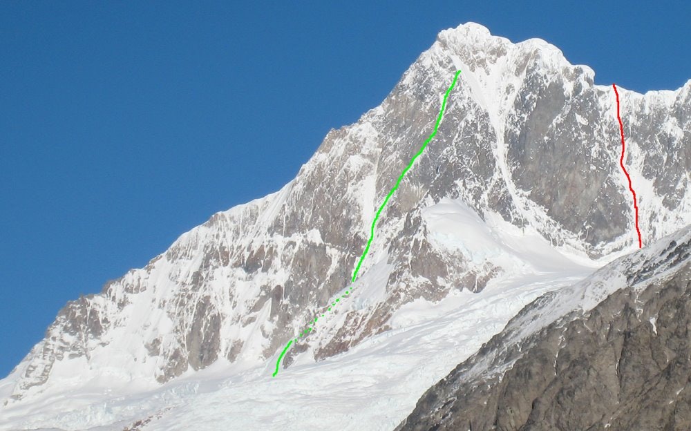 KLATREFJELL: Nordveggen på Monte San Lorenzo (3706 moh) med to av de etablerte klatrerutene inntegnet. Renna, hvor ulykken mest sannsynlig skjedde, vises mellom disse.
