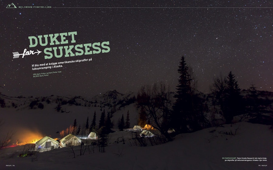 Luksustelttur i Alaska: Det spares ikke på kruttet når Teton Gravity Research stikker til Alaska for å filme. Joda, de bor i telt, men det skorter ikke på badstu, fyrverkeri, helikopter, småfly og hissig skikjøring for det.