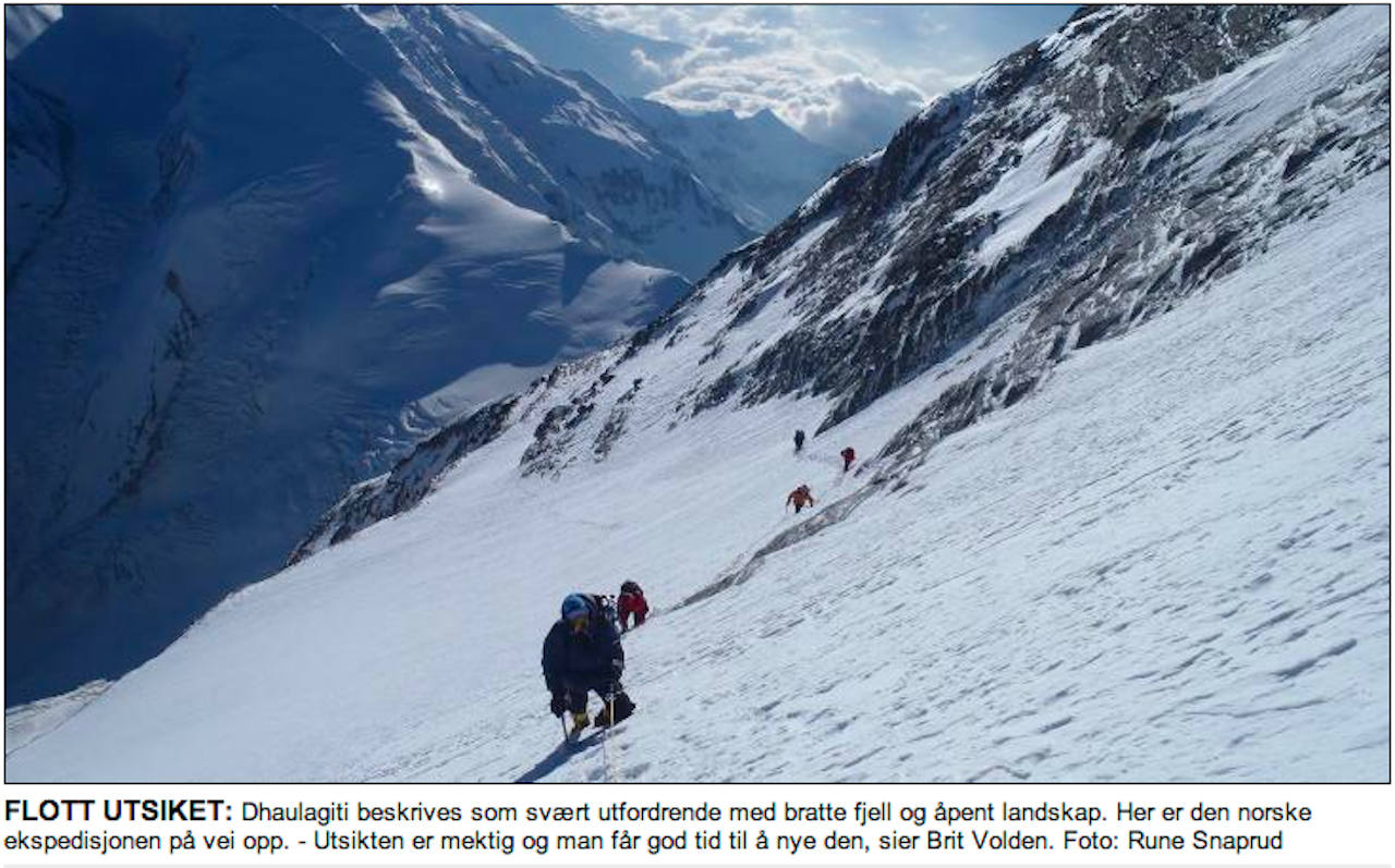 Det er riktignok ikke «breaking news» dette, siden prestasjonen har rukket å bli over to uker gammel, men den må likefullt nevnes med respekt. Lørdag 14. mai sto Stian Voldmo (35) og ekteparet Øyvin Thon (53) og Brit Volden (51) på toppen av Dhaulagiri i Nepal, som med sine 8167 meter over havet er verdens sjuende høyeste fjell. Ingen norske klatrere har kommet til topps her før, så denne bestigningen går sånn sett inn i historiebøkene.
