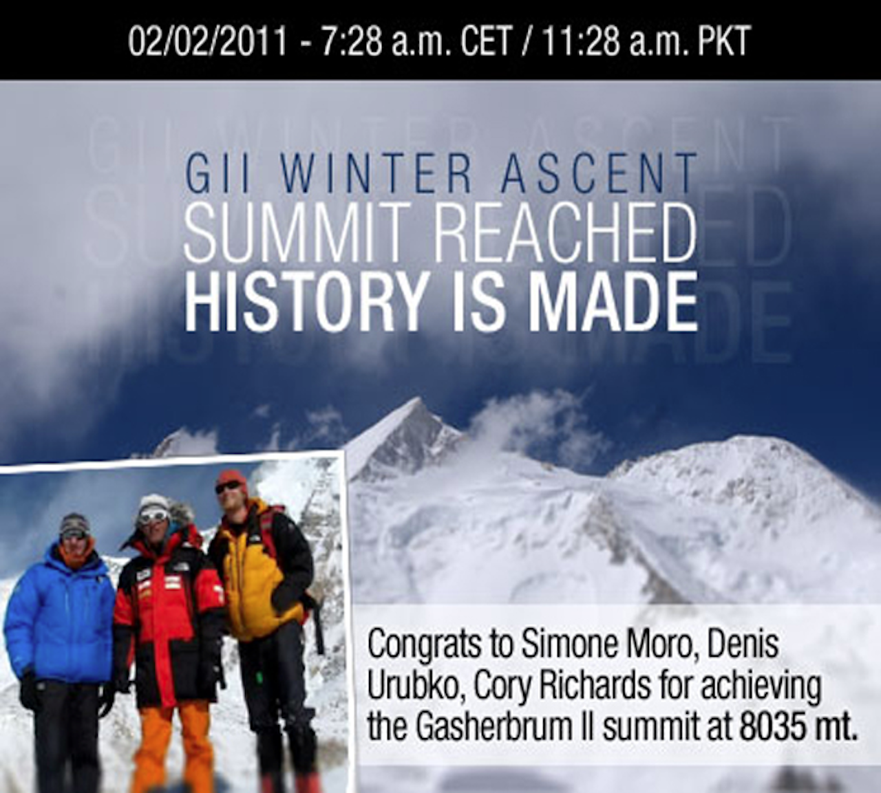 Trioen som de siste tre ukene har opphold seg langs flankene på Gasherbrum II (8035 moh.), kunne i morgentimene i dag nyte utsikten fra toppen av verdens 13. høyeste fjell. Simone Moro, Denis Urubko og Cory Richards kan notere seg for den første vinterbestigningen av Gasherbrum II, og den første vinterbestigningen overhodet av en av Pakistans fem topper over 8000 meter.
