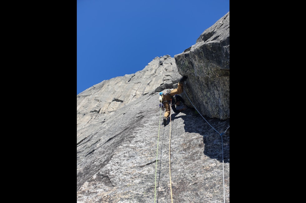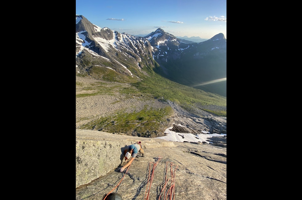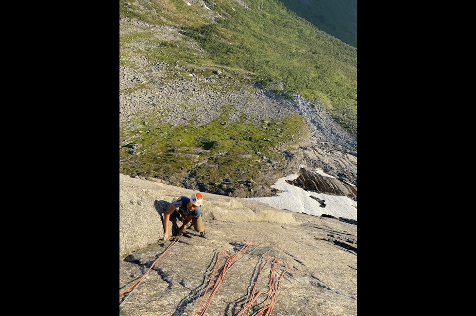 – Karakteren til Stetind er ganske kompakt – enten har du velsikret fin klatring, ellers har du grunne romperiss. Men akkurat taulengden gjennom kaminen (taulengde 4.) i kveldssol var fin. Vi hadde passert det første cruxet og visste at det var lengde til neste spørsmålstegn.