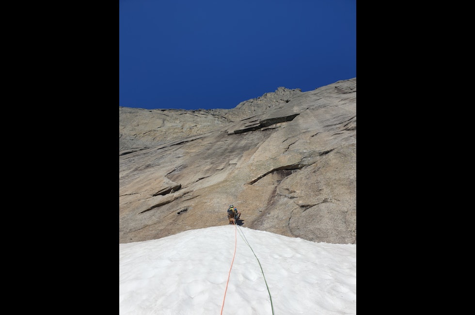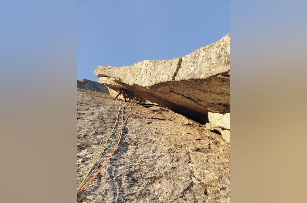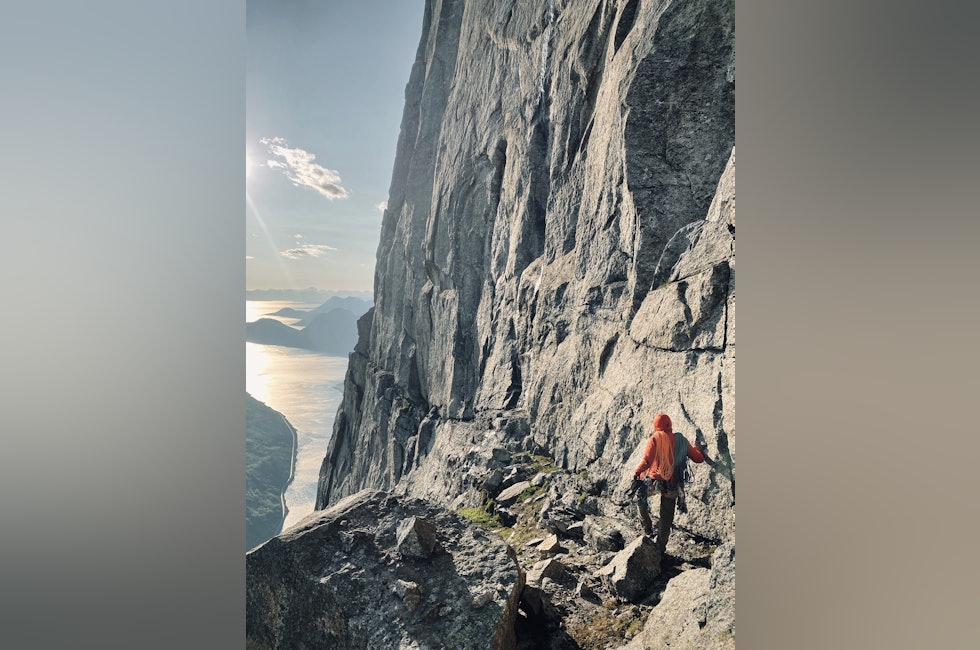 – Jeg hadde tausoloert mye på våren for å komme i form. Så jeg dro til innsteget og var forberedt på tre dager solo i veggen. Jeg fikk vente ganske lenge på havtåka. Første cruxet er bare å komme seg opp i veggen. Ruta jeg hadde sett for meg starter ti meter opp i veggen, og innsteget er et kompakt og bratt sva. Jeg visste ikke om det var mulig å komme gjennom det. Det var såpass tidlig at det lå snø inntil veggen, så jeg fikk heldigvis hjelp av snøen til å komme til det første diedersystemet. Jeg tok meg overraskende langt, cirka 70-80 meter opp, gjennom det første diederet og et takoverheng og videre til det sa stopp ved det første virkelige cruxet: Et parti hvor man må bytte diedersystem. En 7-er-travers på blankt sva. Det tørte jeg ikke gjøre solo.