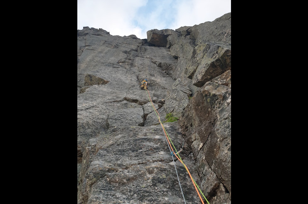 Traverser til venstre på hylla og gå for det gode diederet. Opp dette og gjennom taket til et riss. Føl dette sparsommelig sikrede risset til en god hylle til venstre.