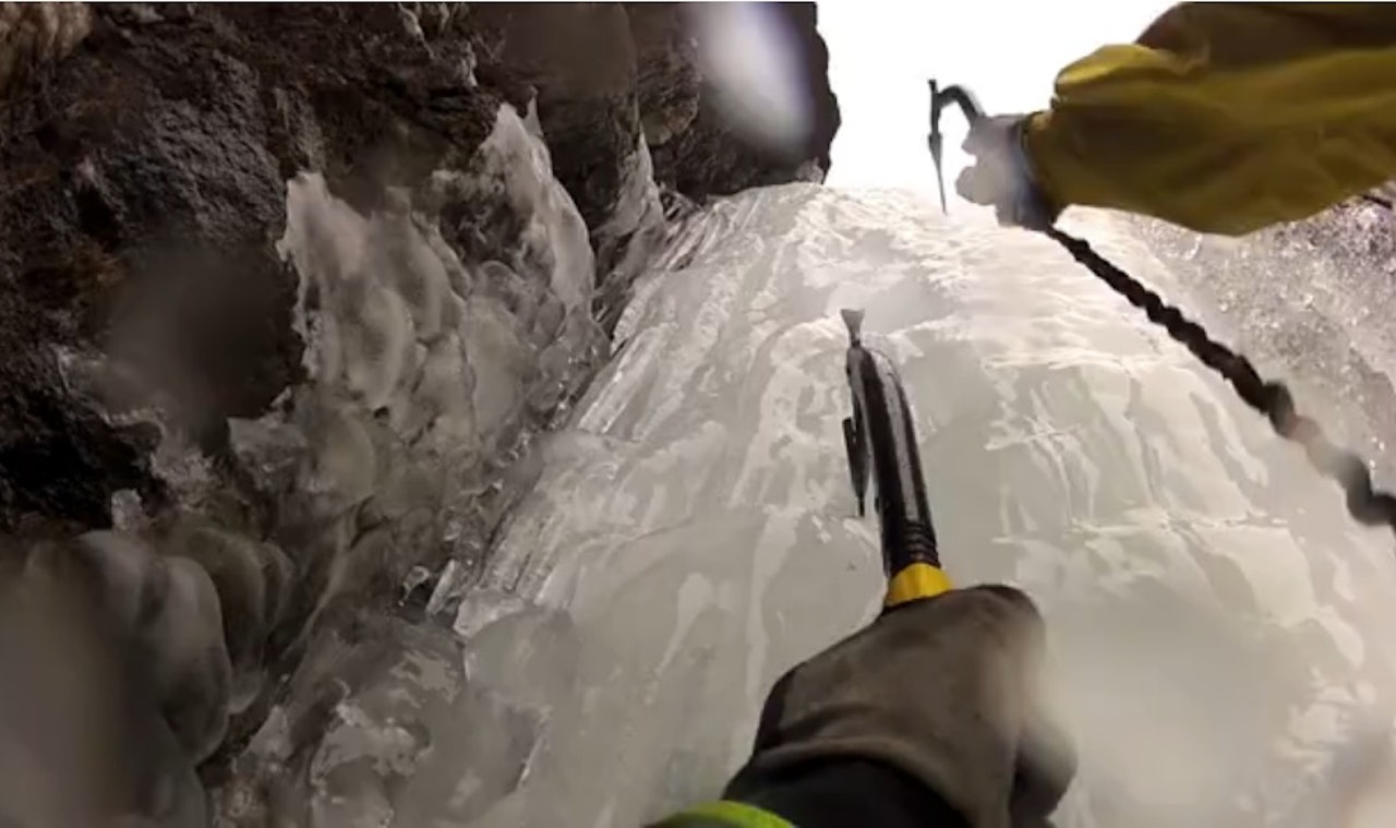 Og med kamera på hjelmen blir det jo også nesten som om vi klatrer fossen selv. Bare nesten, altså: