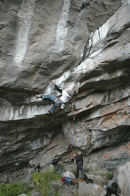 Neste forsøk gikk første del lettere, med et par knelåser. På første anker dro jeg ned en løkke med tau som gjorde at sikreren kunne komme nærmere og redusere taudraget. Dette gjorde jeg selvfølgelig uten å belaste selen. Å dra ut nok tau var et crux i seg selv. Derfra greide jeg å slite meg igjennom siste del, og ruten var besteget!