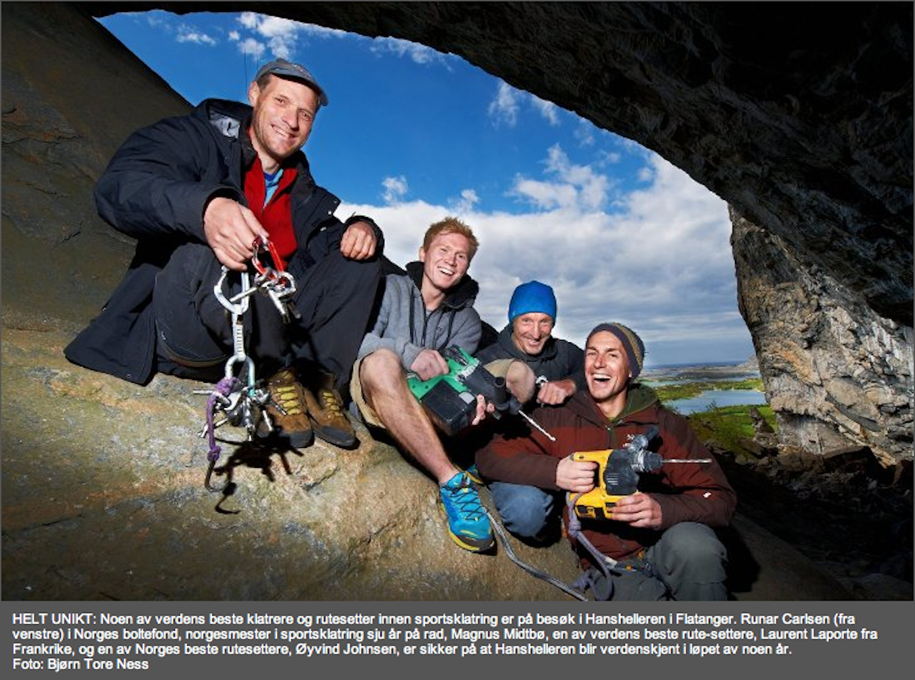 I et oppslag i gårsdagens Namdalsavisa står det å lese at Flatanger nå skal bli en av verdens mest attraktive klatredestinasjoner om klatrer, feltutvikler og Boltefond-gründer Runar Carlsen får det som han vil. Nå er nemlig et på alle måter mannsterkt team i gang med å spotte linjer og bolte opp ruter i den 200 meter brede og 120 meter overhengende Hanshelleren.
