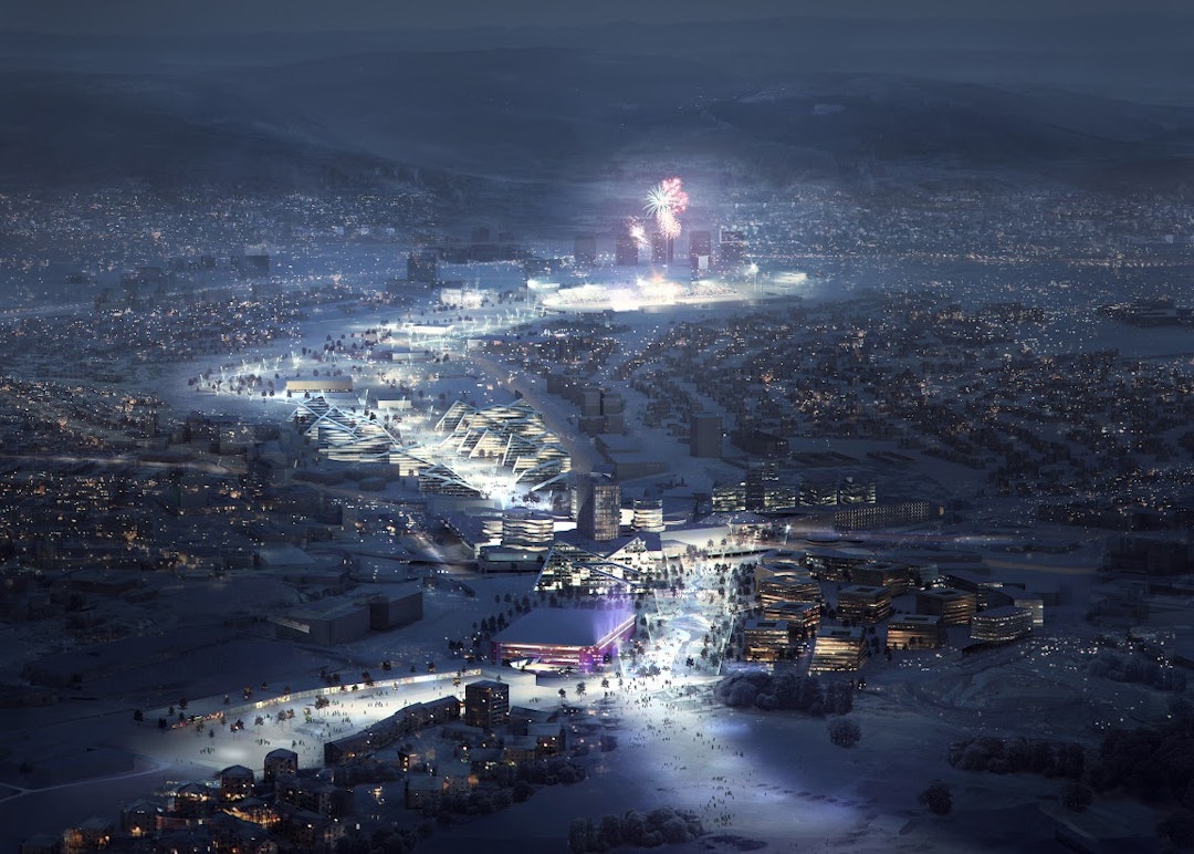 FREMTIDSSCENARIE: Slik skal det altså se ut i 2022, dersom Oslo får OL og arkitektkontoret Snøhetta får det som de vil. Illustrasjon: Snøhetta