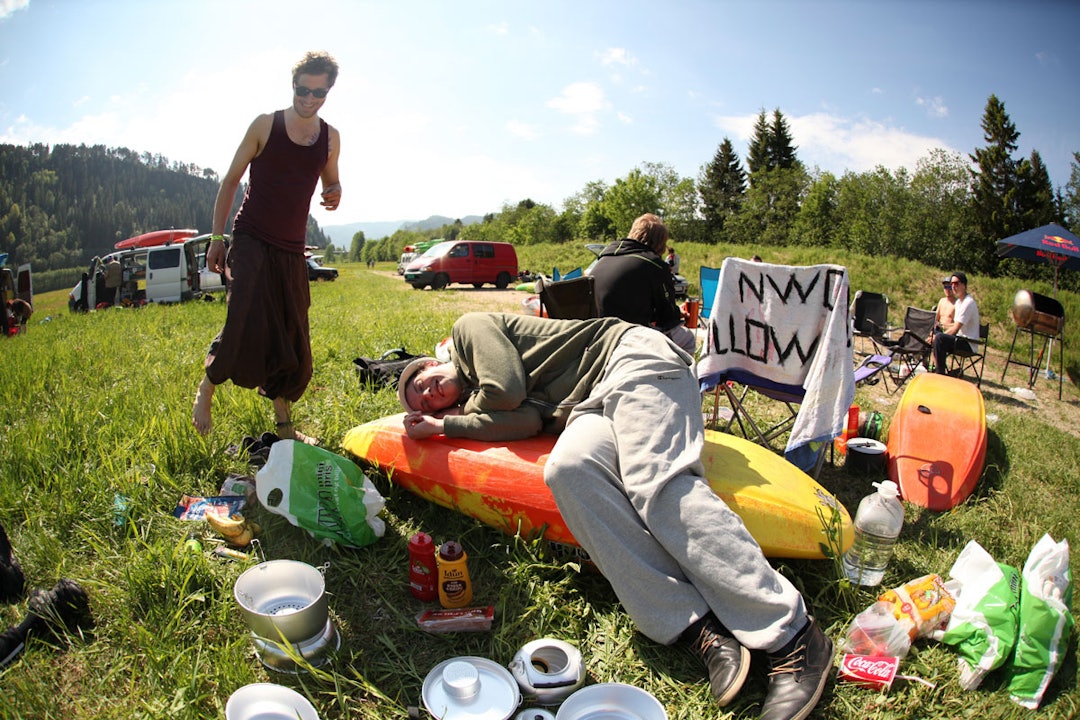 FESTIVAL #2: Slitne menn på kajakker og oppegående menn i skjørt -klare for å rydde etter festen. Foto: Håkon Garvin