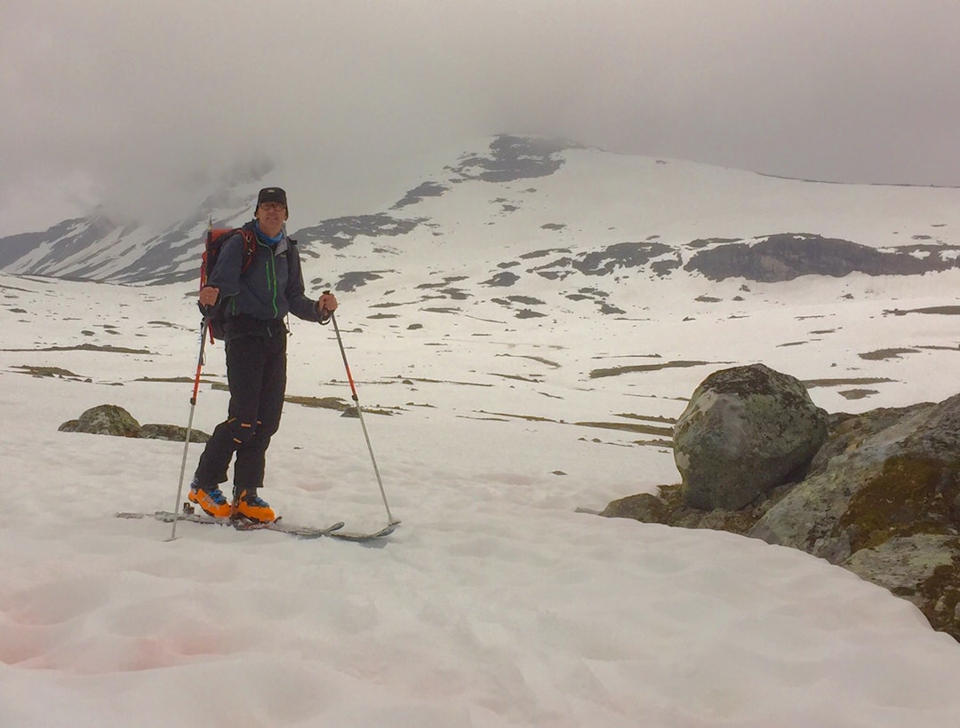 Dagen etter stod Store Rauddalseggje for tur, med start i nydelig vær. Etter hvert kom skyene og innen jeg var på toppen snødde det friskt! Eneste selskap var en rype, helt oppunder toppen. Tur på østtoppen ble avlyst. Dårlig sikt og vått fjell gjorde ikke klyvingen særlig fristende. Heldigvis var skylaget høyt nok til at nedkjøringen i Skarddalen kunne nytes i fulle drag. Vel oppe igjen på bandet mellom Skarddalseggje og Rauddalseggje tittet solen fram igjen og denne gangen ble det deilig cruising ned mot Olavsbu på perfekt sommersløsj. Herlig! Herlig var også middagen en svensk familie bød på. Intet ondt ord om Søta bror!