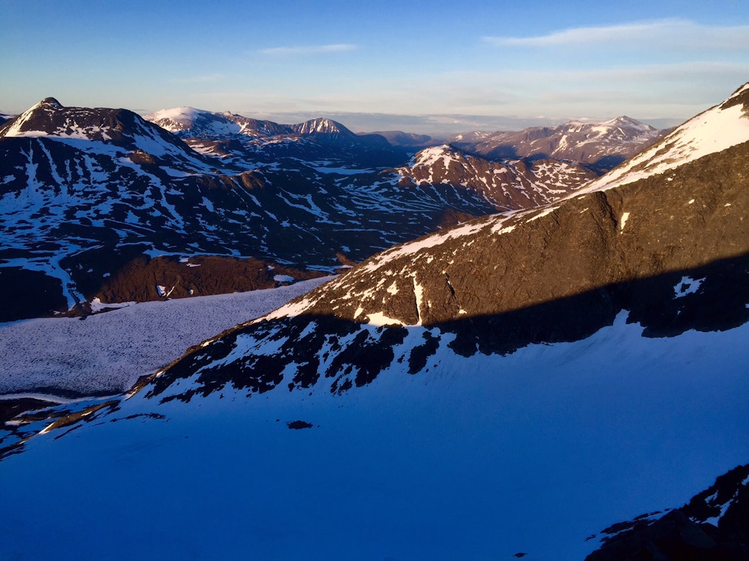 I fjor måtte jeg lete etter sommersnø i Jotunheimen. I år kunne jeg spenne på meg skia 50 m fra Leirvassbu og begi meg ut i det hvite eventyret. Kursen gikk mot Olavsbu, en annen høytliggende hytte i 'heimen. Sen start og toppsug førte til at jeg i 22-tiden nøt solnedgangen fra Skardalseggje. Jeg gledet meg til nedkjøring til Olavsbu på sommersløsj, men nei. Minusgrader ga pappskare og interessante retningsendringer når stålkantene bet seg fast... Ned kom jeg likevel, til hyggelig gjensyn med Olavsbu etter mange års fravær.