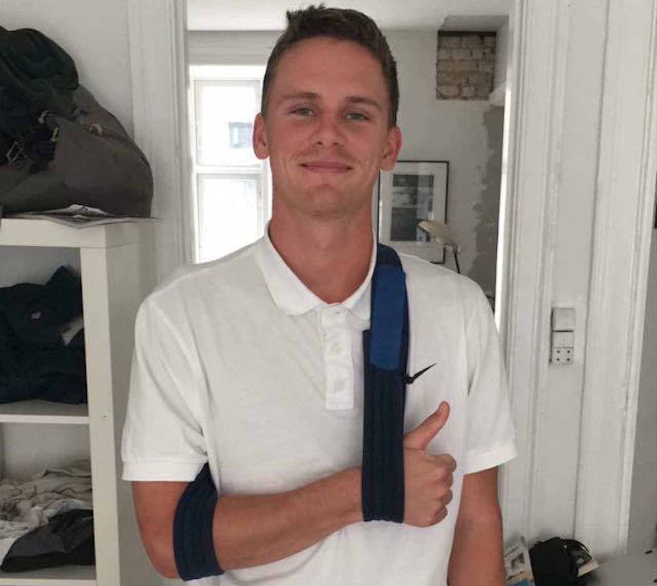 Nei, jeg satt meg opp med en gang å tenkte at dette egentlig gikk jævelig bra med tanke på at jeg akkurat hadde flydd ned havle trappa, men jeg merket ganske fort at det var noe som hadde skjedd med skulderen. Jeg kikket ned på skulderen og der var det absolutt noe som ikke stemte, først trodde vi at jeg hadde fått den ut av ledd, men etter en røntgensjekk på akkutmotaket (som for øvrig lå rett rundt hjørnet) kunne legene konstatere at jeg hadde kragebeinet ut av ledd.