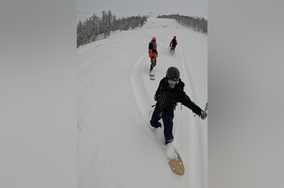 – Etter en lang sesong med sykling begynte det å krible i brettfoten. Med melding om mulige 15 centimeter fersk snø natt til torsdag satte jeg kursen mot Hemsedal onsdag kveld. Og ganske riktig, torsdag morgen ble det servert 14 centimeter tørr nysnø på 15 centimeter såle! Powsurfen var klar og sammen med Torkel Karoliussen, Reidar Øren og Andreas Storebø haiket vi opp Solheisen for tre turer fra toppen, forteller en mildt sagt gira Tallaksrud til Fri Flyt.