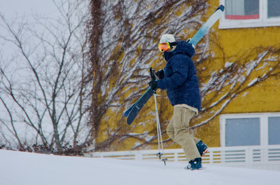 Det er en merkelig følelse å klikke seg inn i skibindingene to meter utenfor egen inngangsdør. For denne inngangsdøren befinner seg nemlig ikke utenfor en enebolig i Oppdal, Valdres eller Tromsø.