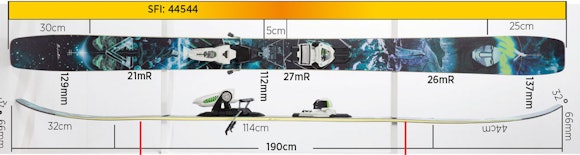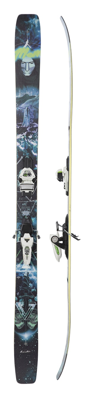 Moment med sine tverre tupper skiller seg ut rekka. Deathwish har mye innsving i bakskia, lengre radius på midten og framme. Det som er mest spesielt her er de markerte lommene i spennet (rødt), rett før rockeren i begge ender. Noe av det samme la vi merke til på testvinneren fra Faction i årets parkskitest. Her ser vi det igjen, men i en helt annen sjanger, og enda mere markert. Den har myk fleks, like mye baktupp som framtupp og kort setback.