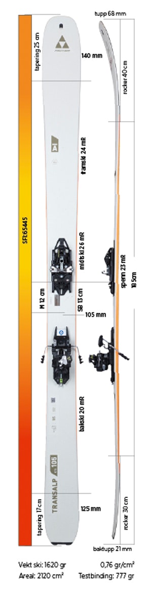 Fischers Transalp-serie består av hele 12 modeller, og CTi 105 er den bredeste av alle. Vekten er temmelig lav selv om skiens trekjerne er forsterket med titanal på midten, samt karbonfiber.