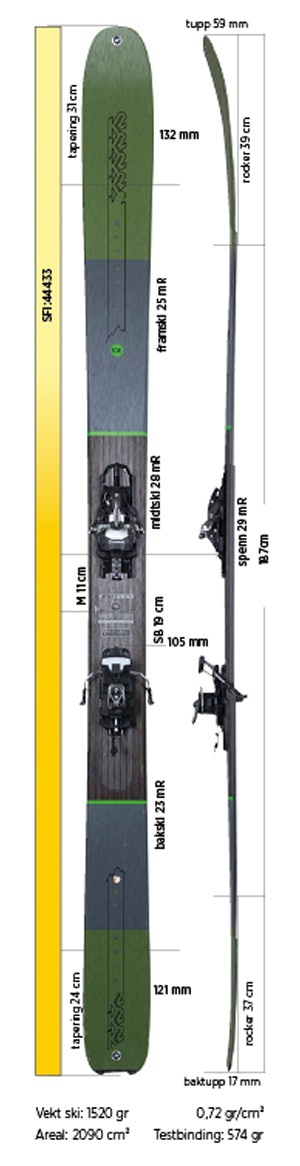 Også denne skia har trekjerne forsterket med karbonfiber og titanal. Vekten er lav, fleksen jevnt myk og spennet moderat. Men svingradiusen midt på skien er veldig lang - den er for så vidt litt lang foran og bak også, men nærmere snittet der.