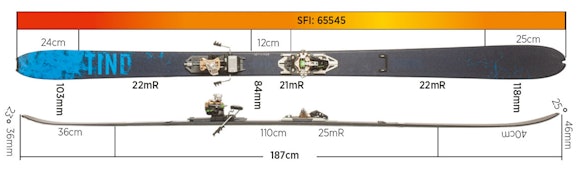 Åsnes slår til med uvanlige detaljer på sin smaleste toppturmodell Tind. Den har bøy i baktuppen og kortfellefeste, noe Åsnes ellers utruster fjellskiene sine med. Rockeren er lang både i fram- og bakskia, middels høyt spenn. Stiv baktupp, myk framski. Framtuppen er relativt lav, ellers er dette testens smaleste skimodell. Egenvekta er ikke blant de laveste. Tind har testens smaleste midje, og nest minste areal.