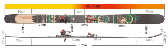 Testens klart tyngste konstruksjon kommer fra 4frnt. 1 gr/cm2 er egenvekt vi kjenner best fra rene kjøreski. Skia har lang taperingssone i framtuppen og en veldig kort rocker i framskia, det er sjelden vi ser at tapering er lengre enn rocker slik som her. Spennet er lavt, skia har stiv framski og myk bakski.