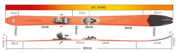 Langt setback og mye innsving i fram- og spesielt bakskia kjenner vi igjen fra Dynafit, det gir en karakteristisk, stor breddeforskjell på fram- og bakski. Markert taperingsovergang, lang rocker i framskia. Lav vekt er typisk toppturekspertene i Dynafit. Baktuppen er stiv, framskia myk.