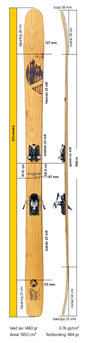 Earlybird Nutcracker er et fornuftig valg for fartsglade toppturentusiaster som vil ha eksotiske ski med spesielt utseende - og veldig flate tupper.