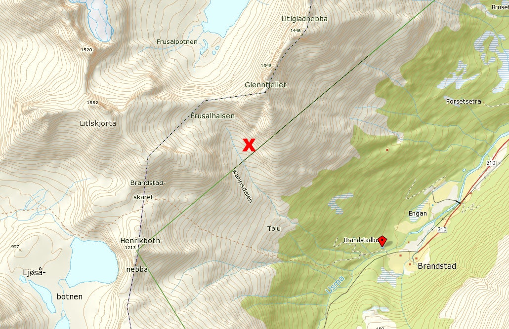 FUNNSTEDET: Det røde krysset markerer stedet hvor de fire omkomne ble funnet, i Kannsdalen sørvest for Litlskjorta.