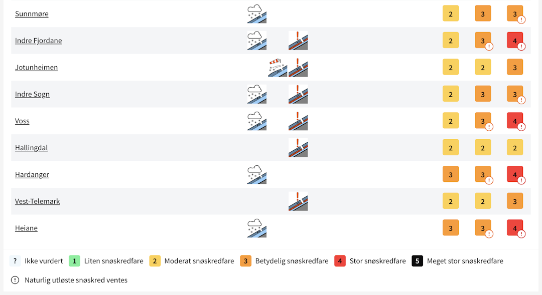 Det oppdaterte skredvarselet er nå vurdert til faregrad 3 for Hardanger og Heiane, mens store deler av Vestlandet øker til faregrad 3 og 4 lørdag og søndag.