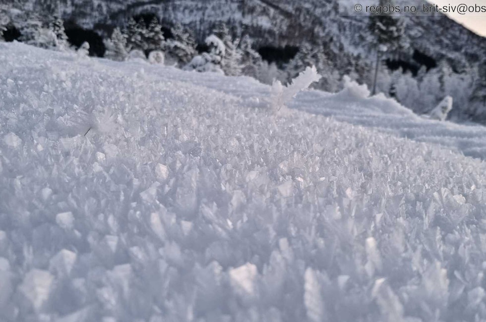 På Nordvestlandet avhenger skredfaren de neste dagene av hvor mye snø og vind som kommer. Nysnøen vil legge seg på et svakt snødekke av rim og kantkorn, som er en følge av kulden den siste tiden.