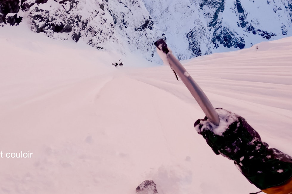 Fjellsiden er så bratt at det ikke er mulig å stå i veggen uten å holde seg fast. Hele nedkjøringen ble dessuten gjort med én isøks i hver hånd.