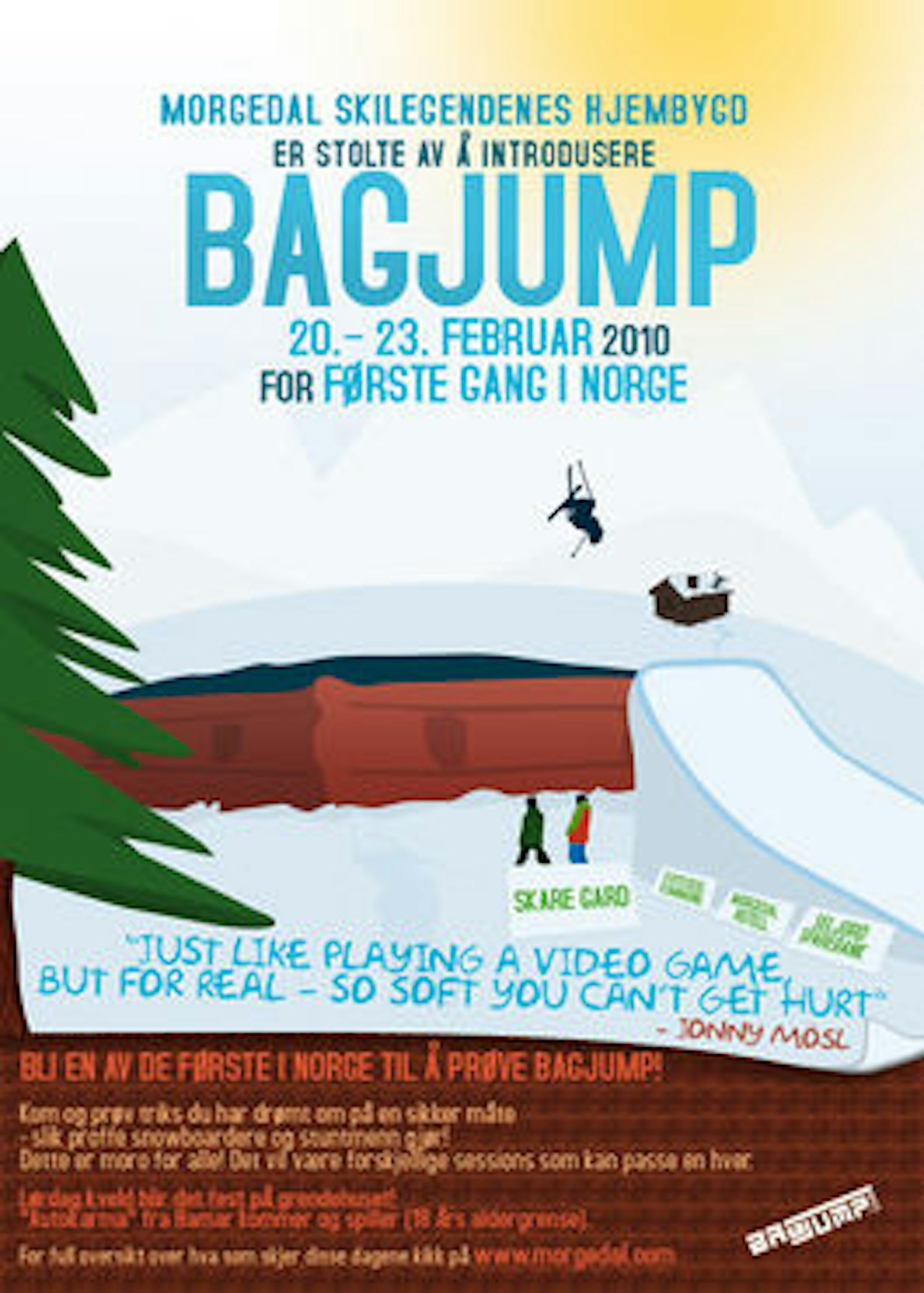 I Morgedal blir det allikevel første gang Bagjumpen kan testes av gud og hvermann. Bagjump representerer mer sikkerhet og er utviklet av proffe ski og snowboardere sammen med profesjonelle stuntmenn.