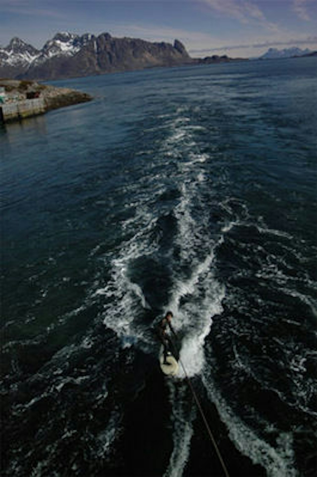 Under brua fosset vannet. Flere tonn ble tømt ut for hvert minutt som gikk. Jeg hoppet uti. Sakte ble jeg dratt ut i det sterkeste partiet i strømmen. Der reiste jeg meg forsiktig, og etter hvert begynte jeg med svinger og små hopp. Jeg hadde en sikkerhetsline rundt magen slik at jeg ikke skulle gå med strømmen ut i havet.