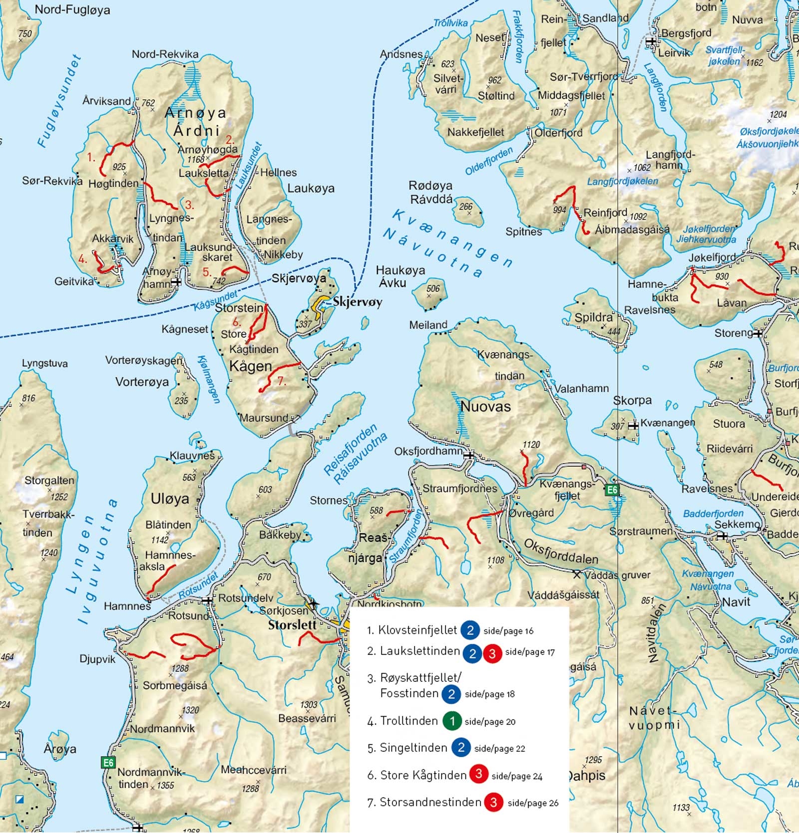 Det er mange fjell i området. Høyest er Store Kågtinden (1228 moh.) på Kågen. Også Arnøya og Uløya har fjell over 1000 moh. med Arnøyhøgda (1170 moh.) og Blåtinden (1139 moh.).